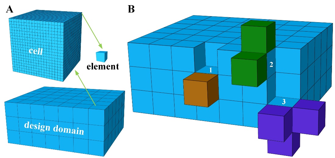 图1. (A)设计域被划分为多个子域,每个子域包含多个单元. (B)设计域以子域为单位进行更新.