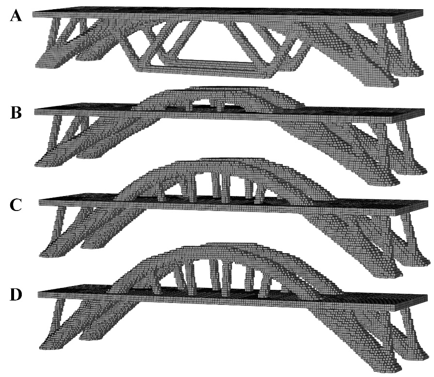 图2.所得优化之桥梁随设计域之演化而逐步变化;由(A)至(D),结构性能提升约1/3.