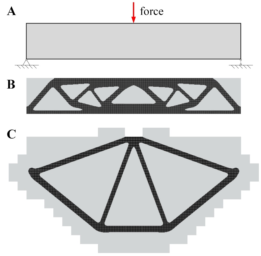 图3. (A) MBB梁优化问题的载荷与边界条件. (B)在初始设计域(灰色)内得到的优化结构(经典解,黑色). (C)使用ADD方法得到的优化结构(黑色)明显不同于(B)中经典设计,且结构性能提升超2/3.