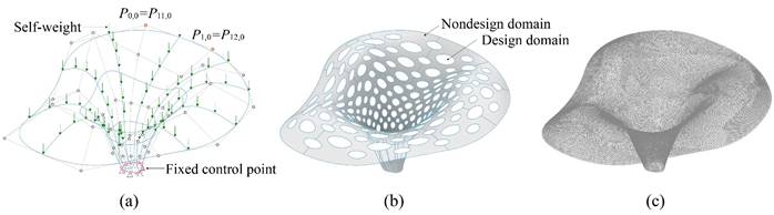 图3.伞状壳结构设计. (a)非均匀有理B样条曲面模型, (b)设计域和非设计域, (c)网格模型.