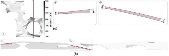 图2.大跨度壳形状—厚度耦合优化结果. (a)厚度分布, (b)沿(a)中红线剖断所得截面, (c)两个区域的局部放大图.