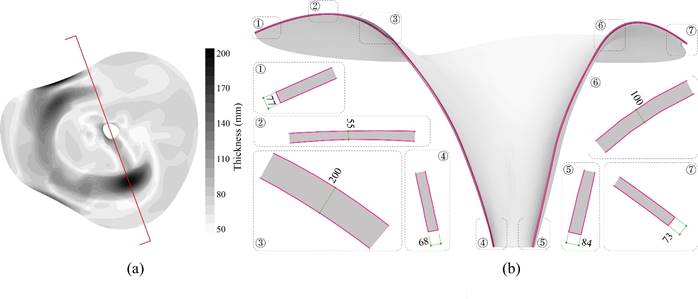 图5.伞状壳结构形状—厚度耦合优化结果. (a)厚度分布. (b)沿(a)中红线剖断所得截面,以及7个区域的局部放大图.