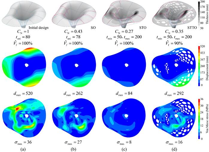 图4.伞状壳结构优化结果. (a)初始设计, (b)形状优化, (c)形状—厚度耦合优化, (d)形状—厚度—拓扑耦合优化.