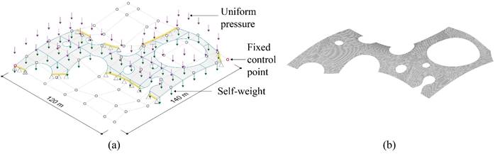 图1.大跨度壳结构设计. (a)非均匀有理B样条曲面模型, (b)网格模型.