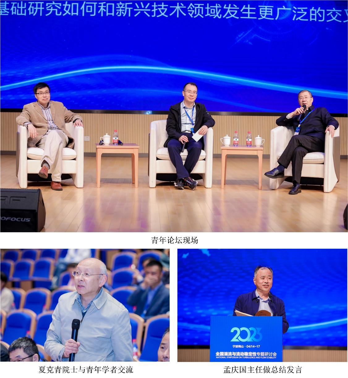 孙晓峰教授、上海大学刘宇陆教授、中国船舶集团有限公司技术首席颜开研究员就“如何让湍流基础研究在‘四个面向’中发挥更大作用”,“从事湍流基础研究的青年科技人员的成长路径有哪些”,“基于超大规模数据的深度学习能否改变湍流研究范式”,“湍流基础研究如何和新兴技术领域发生更广泛的交叉”四个问题与在场专家及年轻学者们展开深入交流讨论,获得了热烈掌声和共鸣。最后,国家自然科学基金委数理学部孟庆国副主任做总结发言,重点谈及了流体力学研究的现状、困境、机遇和未来发展路径,孟主任鼓励广大从事湍流基础研究的青年科学家把个人事业发展融入国家发展的大格局中,立足国家重大需求选好研究方向,坚持守正创新,沉下心来做解决真问题的原创研究,坚持合作交流集智攻关,让湍流研究的道路越走越宽。