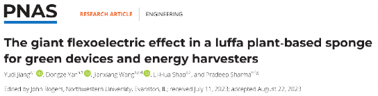 近日,我院固体力学所邵丽华教授与北京大学王建祥教授,美国工程院院士、休斯顿大学Pradeep Sharma教授合作,在国际顶级期刊《美国科学院院报》(PNAS)发表研究论文《The giant flexoelectric effect in a luffa plant-based sponge for green devices and energy harvesters》。该工作报道了天然生物材料—多孔丝瓜络的巨挠曲电效应,提出了一种将多孔生物材料作为绿色环保柔性发电机及其他智能器件应用的新策略。论文的共同一作是我院硕士研究生蒋雨滴(已毕业)和博士研究生闫东泽,邵丽华教授为论文的唯一通讯作者,春满四合院