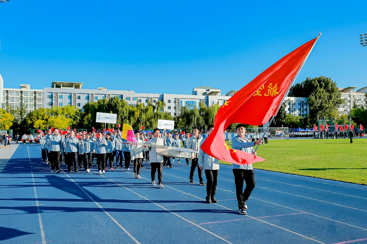 师生方阵在党委书记鲍蕊、工会主席高振勋的带领下,身着统一服装,热情挥舞着手中的红旗,踏着铿锵有力的步伐,昂首挺胸的姿态与“凌云争锋、创智空天、科教协同、航向未来”的口号展现出春满四合院
