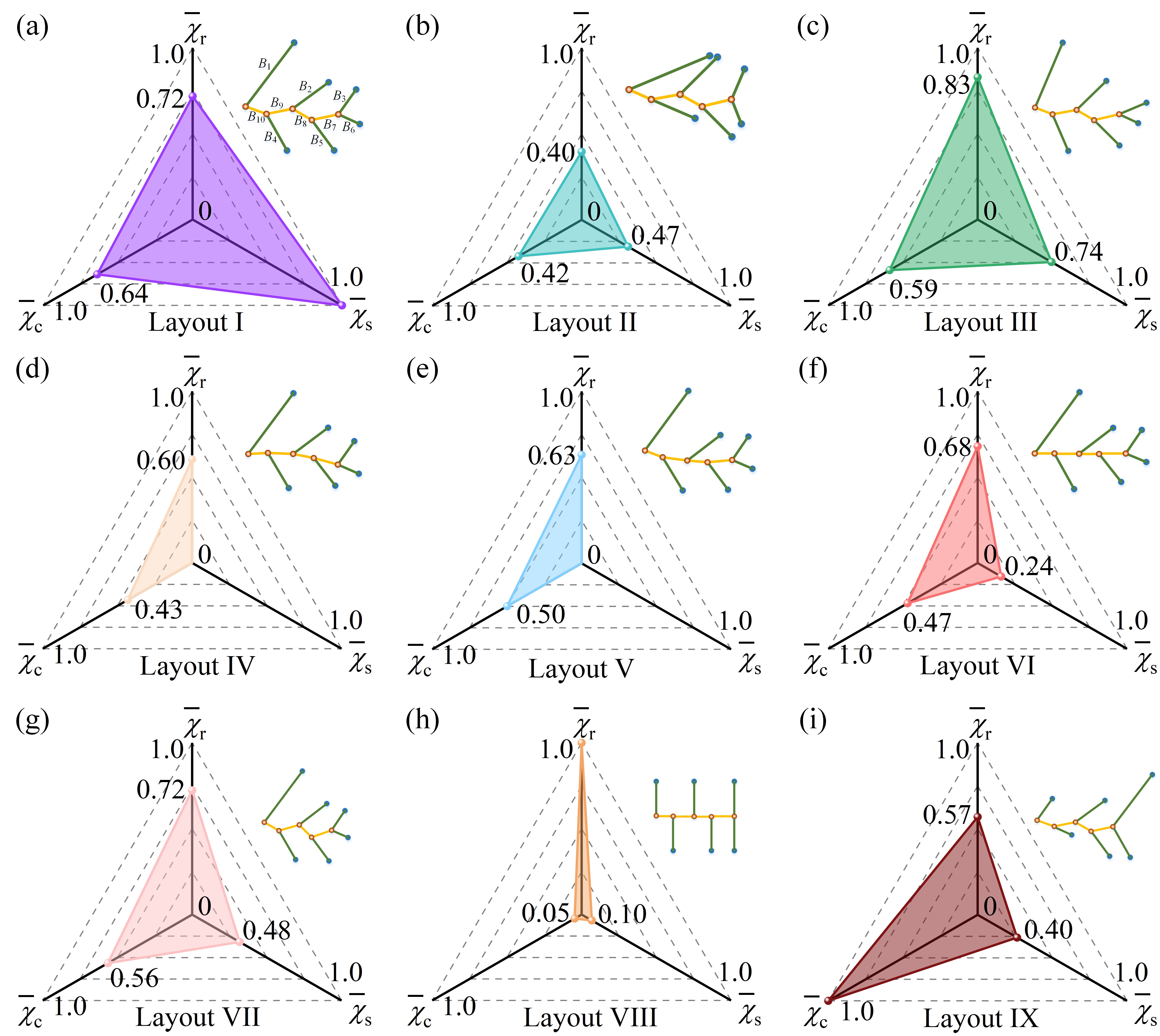 研究者们构造了九种典型的卷须结构。图3对比了它们的力学性能。通过统计外力沿不同方向作用时参与承载的小枝的数量,评估结构的承载范围(三角形上顶点)。通过考察不同工况下卷须的等效刚度,衡量结构的承载能力(三角形左下顶点)。通过分析卷须各小枝应力的差异,计算结构的承载效率(三角形右下顶点)。图3d、3e中的结构能兼顾两个方面的性能,但却在承载效率方面有所欠缺。图3h、3i中的结构在某一方面具有十分优异的力学性能,但在其他方面却表现平平。纵观图中所有构型,仅有图3a中的结构综合表现优异;而该结构正是唯一一个由真实卷须简化而来的构型。