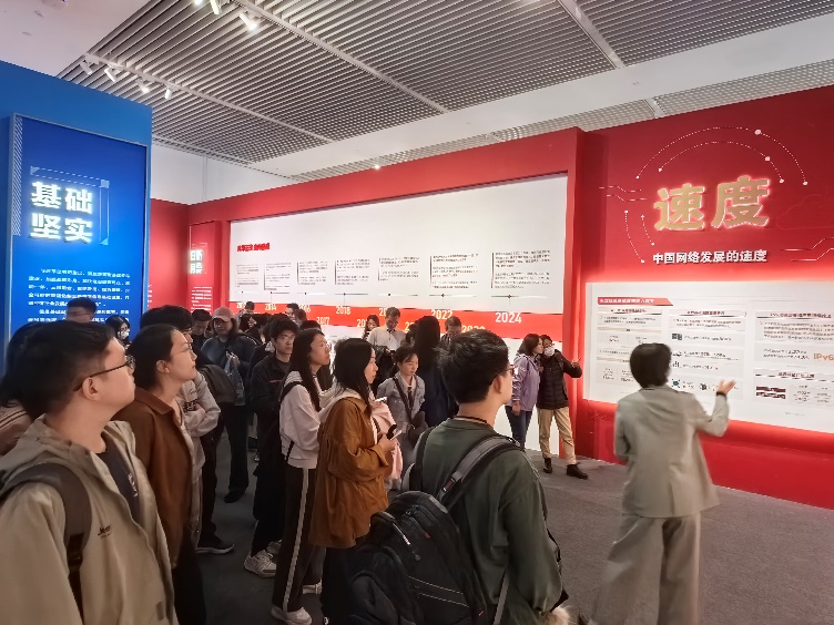 在讲解员的带领下,支部成员认真参观了本场展览。“网络发展新图景成就展”共分为“日新月异”“基础坚实”“融合赋能”“普惠利民”四大篇章,全面回顾党的十八大以来我国信息通信业建设发展的辉煌历程,生动描绘了网络强国建设的壮丽画卷。
