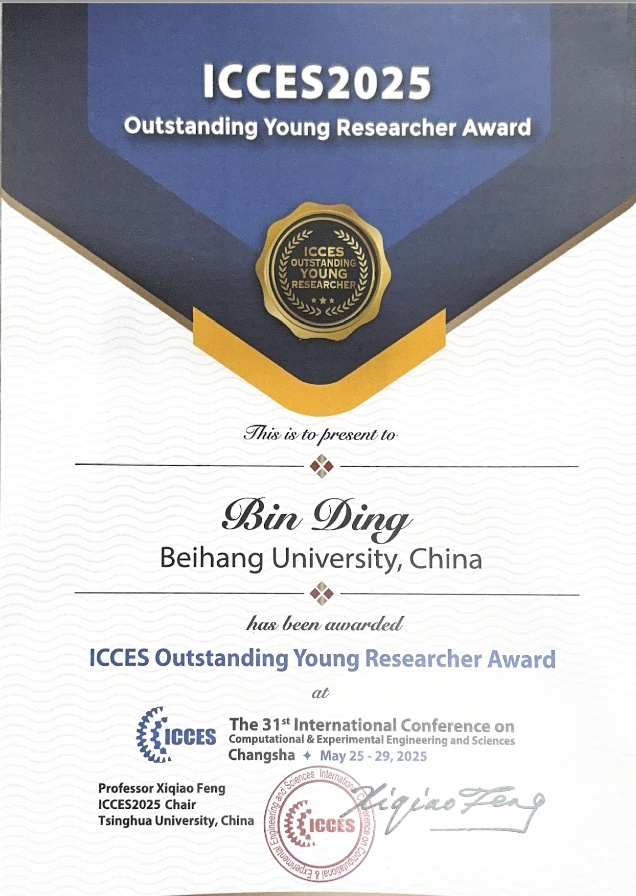 2025年5月25日至29日,第三十一届国际计算与实验科学工程大会(ICCES)在湖南长沙隆重举行。会上,我院丁彬副教授凭借其在微纳米力学与能源材料力学领域的突出贡献,被授予“ICCES Outstanding Young Researcher Award”(ICCES杰出青年学者奖)。