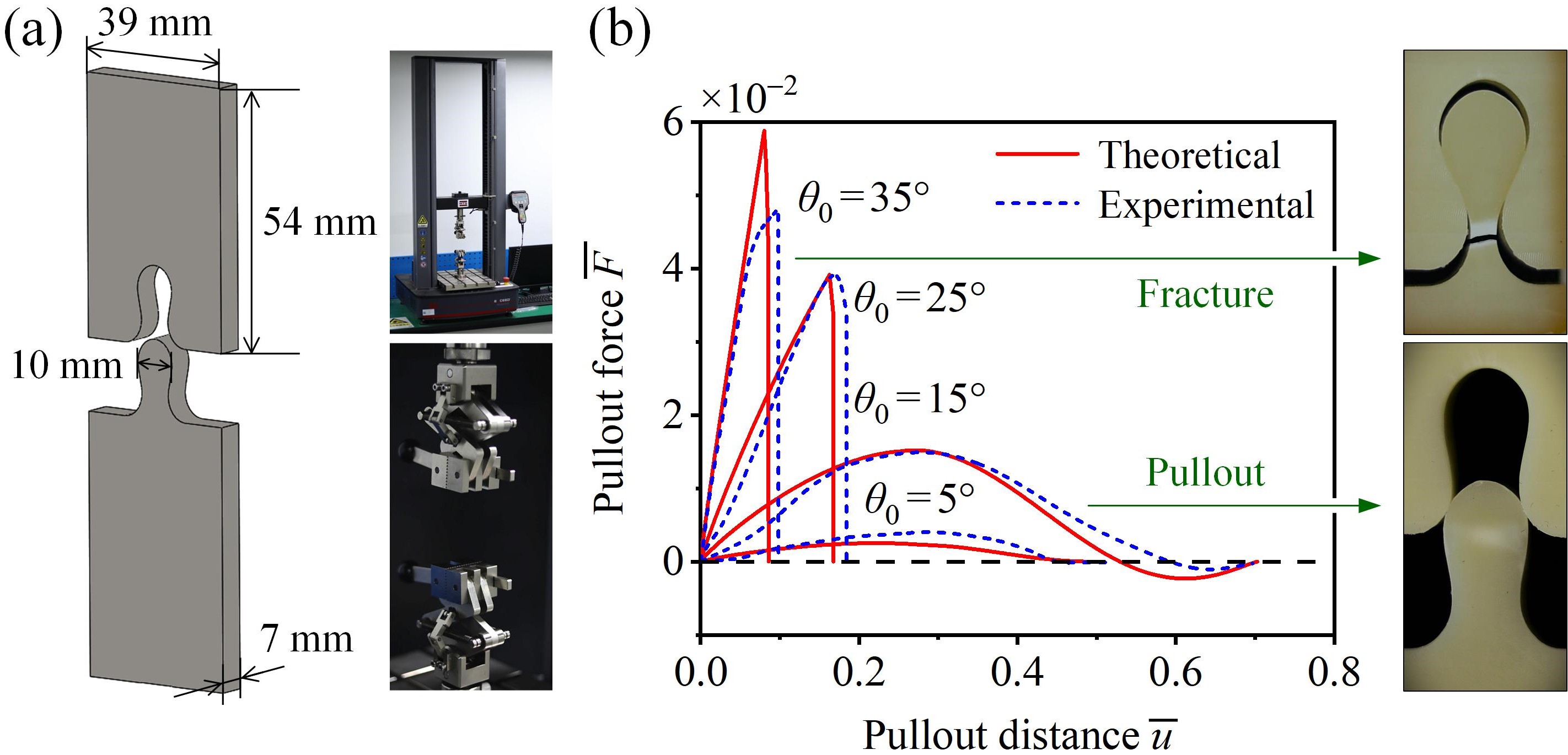 图3 理论分析与实验测量的结果对比。(a)试件的几何尺寸与实验装置;(b)理论预测与实验测量所得的拉拔力—拉拔距离曲线,其中右侧展示了两种不同的力学响应形式——结构在被拉离之前发生断裂(上)、结构被完全拉离且未有材料发生破坏(下)。
