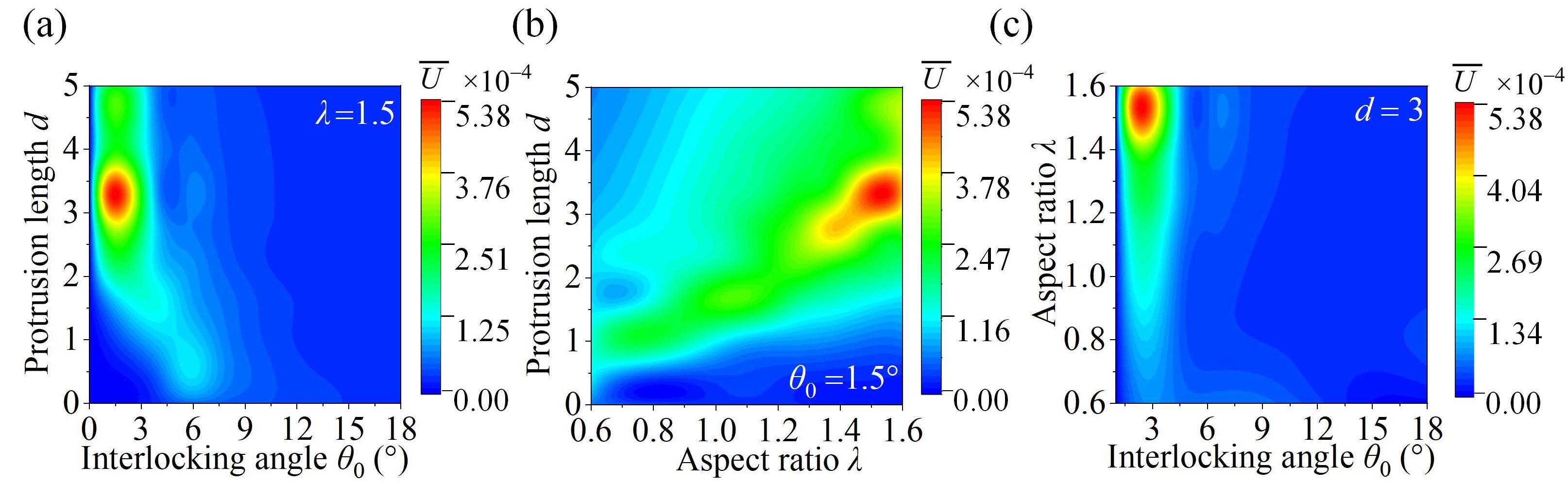 图6 叉指型缝线结构的最优化形态。当(a)纵横比、(b)联锁角、(c)指凸长度给定时不同参数组合下结构的韧性。