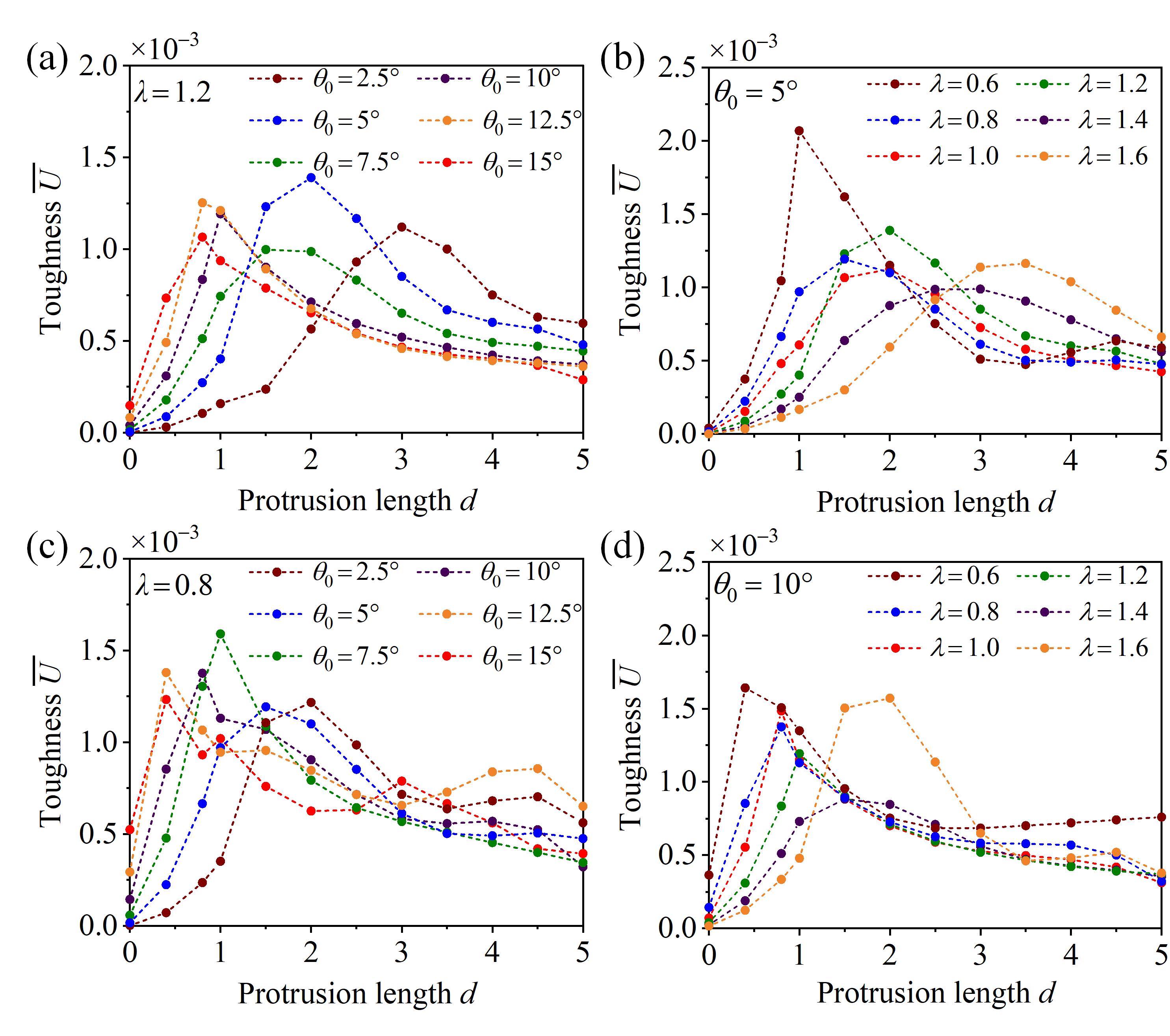 图5 不同几何尺寸下指凸长度对结构韧性的影响。当纵横比或联锁角给定时的各类情形。