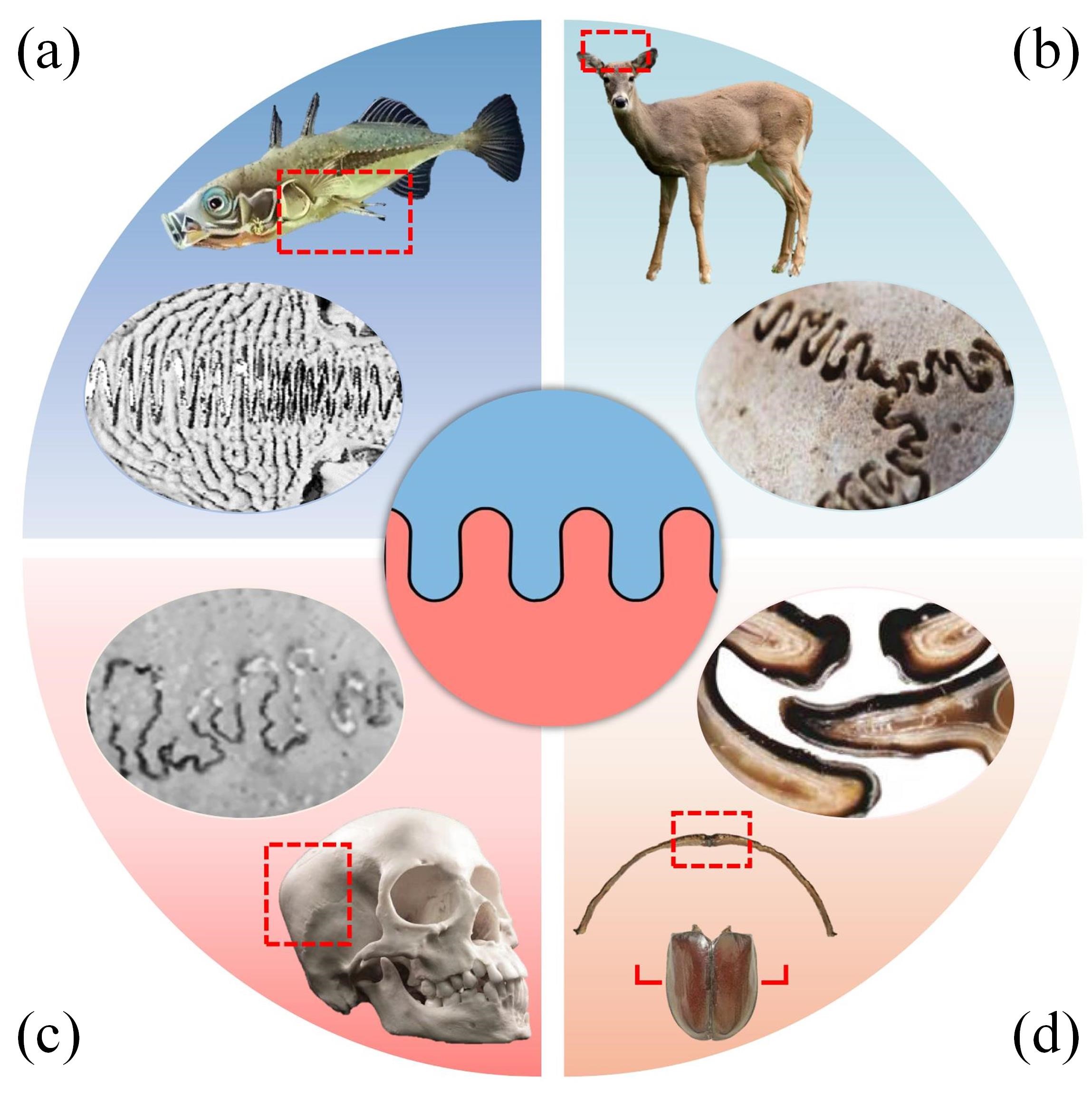 图1 几种典型的叉指型缝线结构。(a)海洋三棘鱼骨板;(b)白尾鹿头骨;(c)黑猩猩头骨;(d)双叉犀金龟翅鞘。