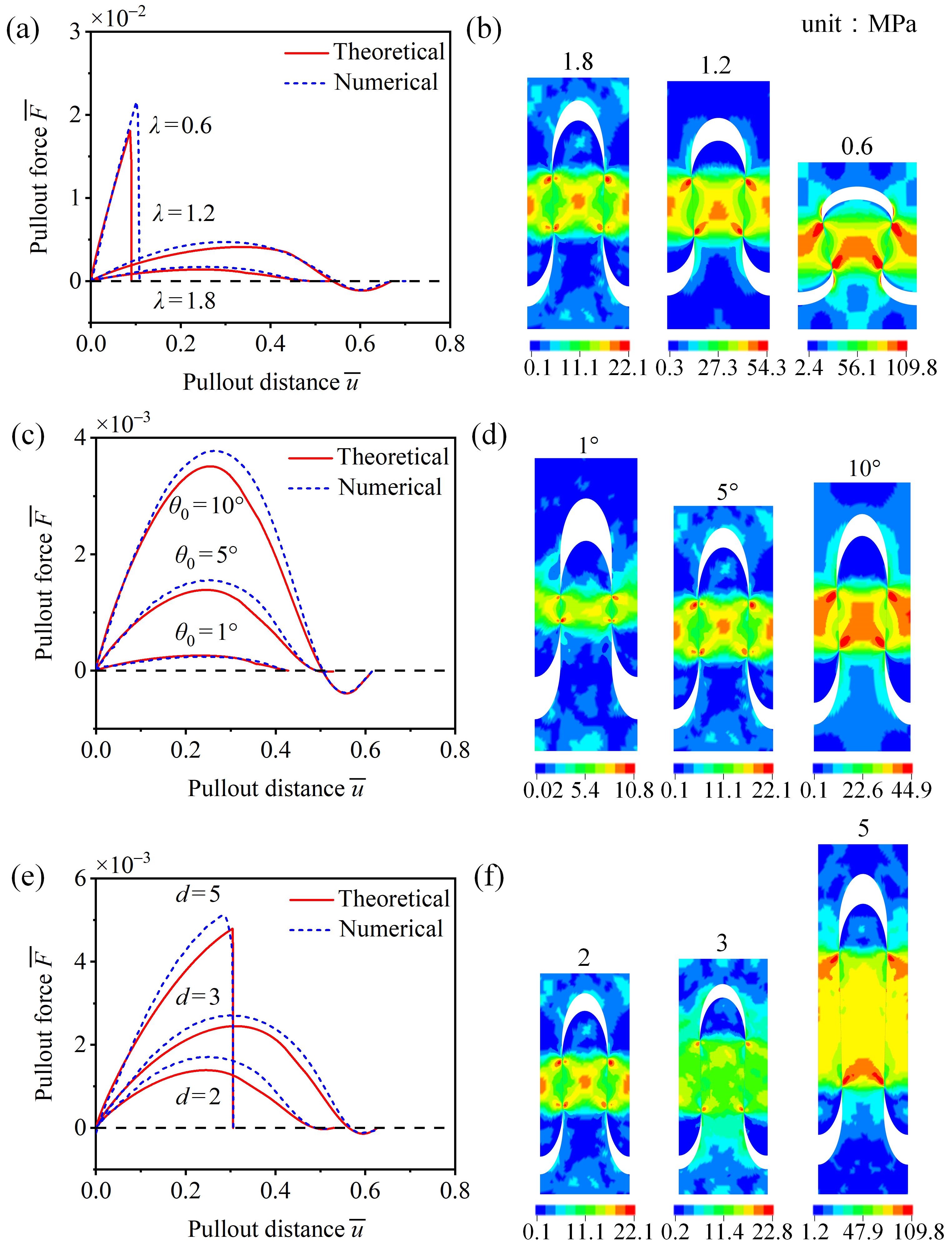 图4 理论分析与有限元计算的结果对比。(a)—(f)分别为不同纵横比、联锁角和指凸长度所对应的力学响应,其中左侧为拉拔力—拉拔距离关系,右侧为典型时刻结构中von Mises应力的分布。