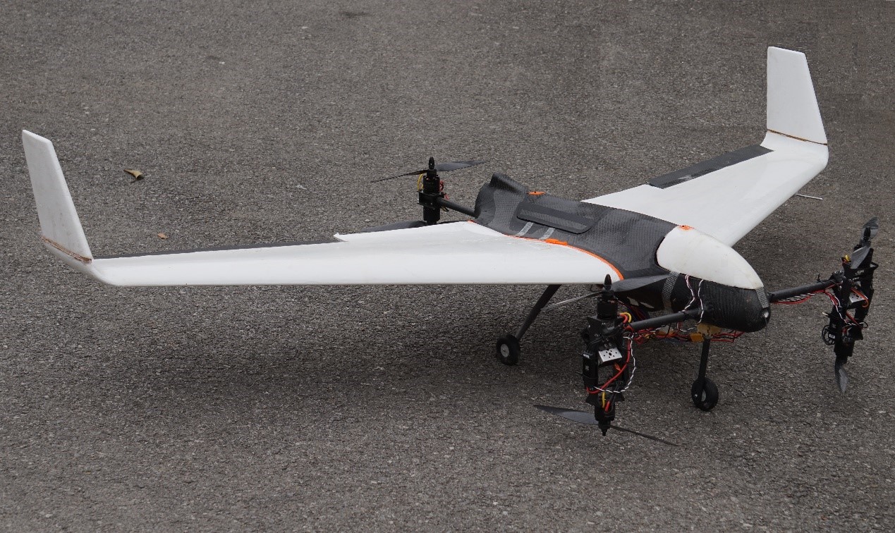 这一阶段项目获得了北航飞行力学与安全系的关键技术支持,同时获得了大学生创新创业训练基金1万元人民币额度的支持。在飞行力学实验室的基于RASS系统的硬件在回仿真设备的支持下,项目成员对过渡控制方法进行了全面升级,放弃了前拉电机,采用伺服控制机构来实现垂直电机的转向,并放弃了两轴式布局,改为稳定性,安全性更高的三轴六桨式设计。在为期一年半的控制律研发,团队提出了一种以空速作为转换判据的倾转控制程序和旋翼差速与气动舵面耦合的全新抗风增稳算法。