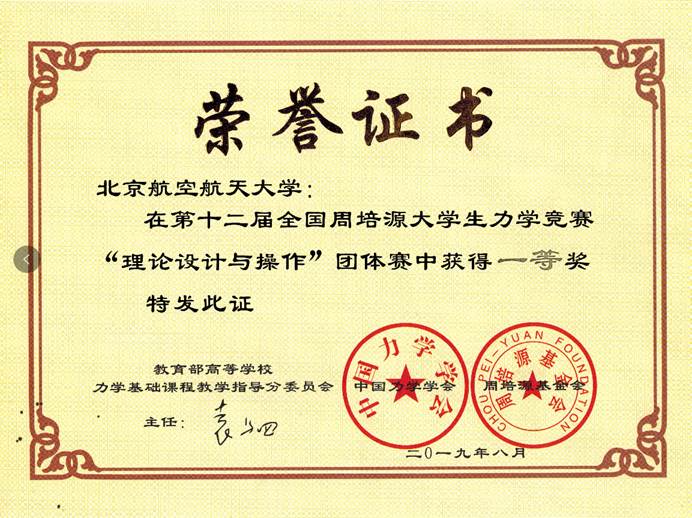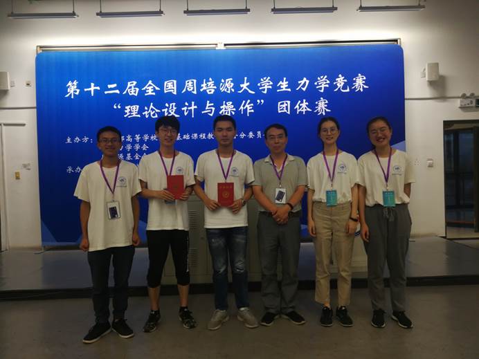 蔡能府、杨泽鹏、夏莹洁,机械工程及自动化学院杨应科以及可靠性与系统工程学院陈小琦。我院苏飞和赵振老师从7月16日开始对入选的同学进行了为期20天的集中培训,期间参赛同学积极备战,对每一次作品的成败得失及时进行总结,迅速提高了竞技能力和状态。除了进行紧张的赛前培训,指导老师特意邀请了上一届代表北航参赛并获一等奖的李志男和田娇两位同学做经验介绍,她们对周培源力学竞赛团体赛的比赛情况、注意事项、比赛过程中可能遇到的情况和应对措施等进行了分享,给了参赛队员们很大的鼓励,帮助队员们为比赛做更加充分的准备。
