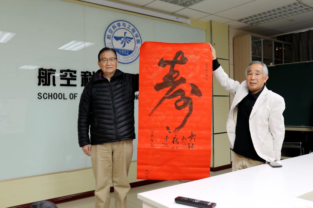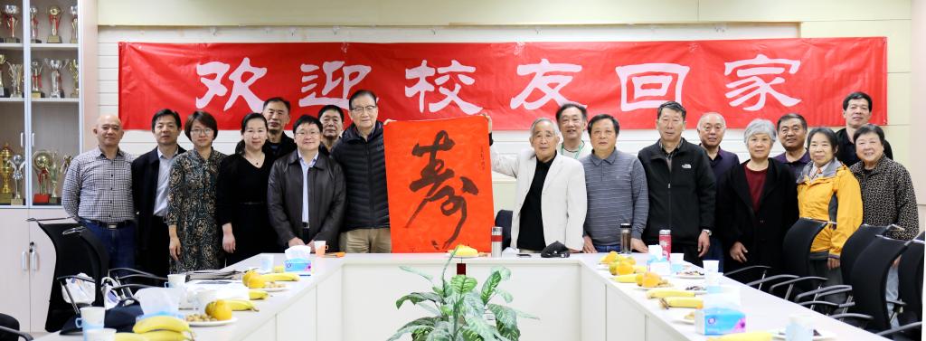 随后校友返校召集人郭义明老师,代表4551班班向王浚院士赠送了寿字条幅,衷心祝愿王浚院士健康长寿。随后大家进行了交流、座谈,共同追忆昔日校园生活,重叙师生友情。有的同学四十二年都没有见面,互相问候,很是惊喜和激动,同时大家也对春满四合院