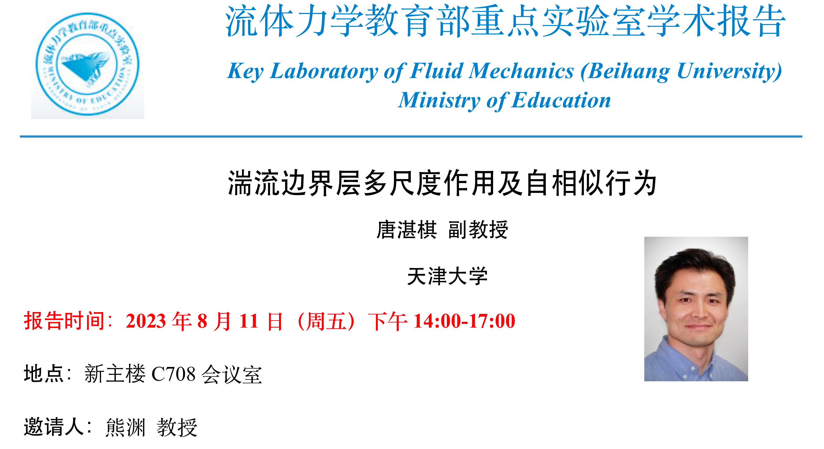 2023年8月11日,受熊渊教授邀请,天津大学唐湛棋副教授到我院流体力学教育部重点实验室做学术交流报告,报告题目为“湍流边界层多尺度作用及自相似行为”。报告由熊渊教授主持,春满四合院