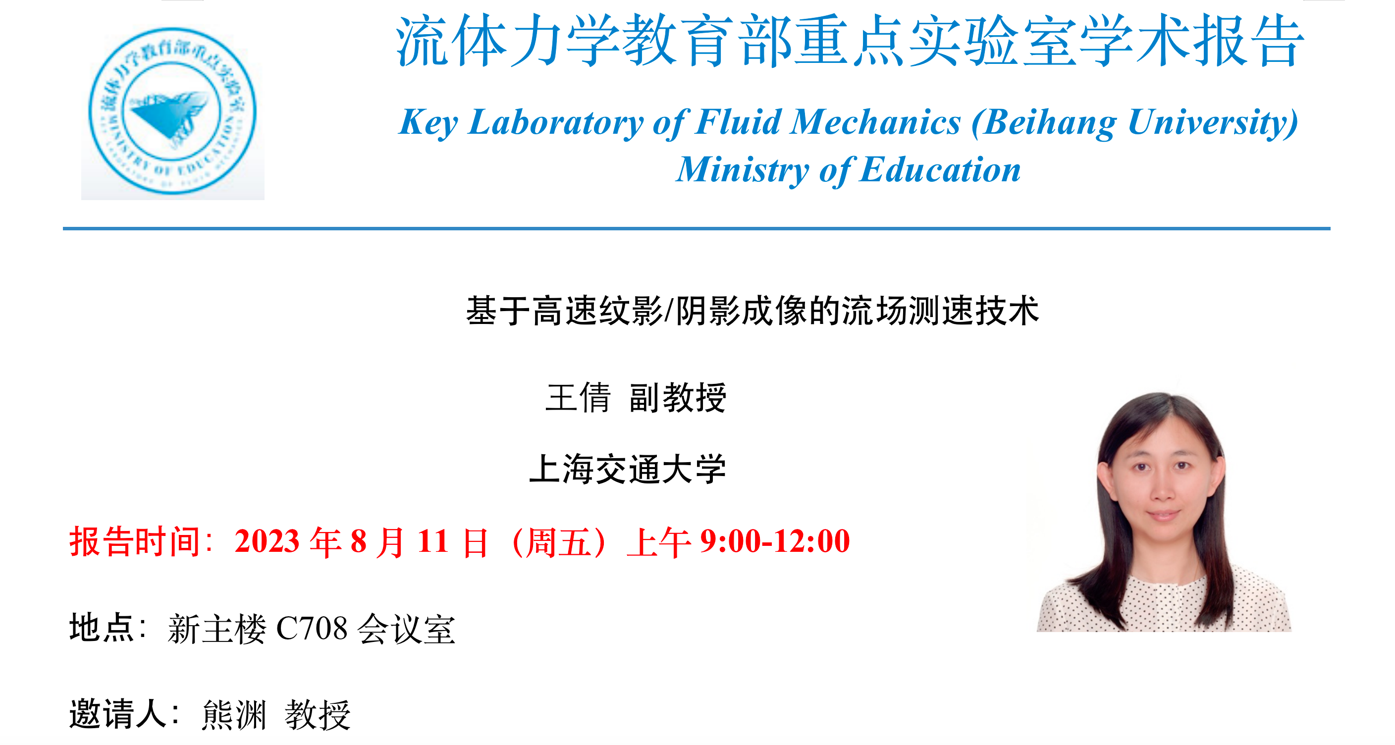 2023年8月11日,受熊渊教授邀请,上海交通大学王倩副教授到我院流体力学教育部重点实验室做学术交流报告,报告题目为“基于高速纹影/阴影成像的流场测速技术”。报告由熊渊教授主持,春满四合院