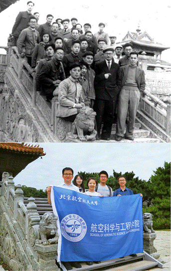 图2新中国第一个飞机设计室的创建者徐舜寿先生带领青年设计团队参观沈阳北陵(上);跟随前辈脚步在同处合影致敬前辈(下)