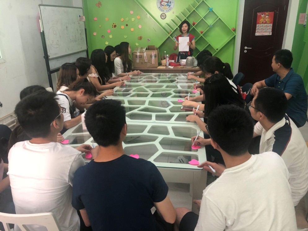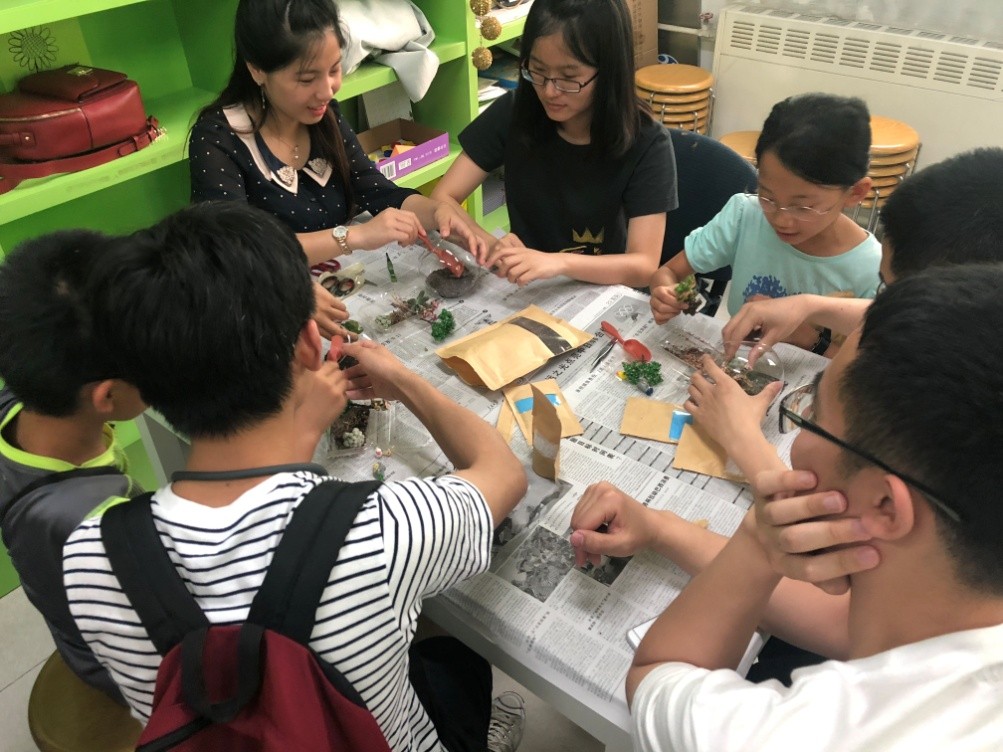 小朋友们对支部成员的到来表示欢迎,简单的熟悉之后,青年汇的社工开始为大家介绍多肉的种养特点以及栽种多肉的方法,并且向大家分发种植多肉的必要材料。之后大朋友小朋友们一起动手,互相合作,一边种植多肉,一边添土,小朋友们开展自己的想象力,在大朋友的帮助下,将一个个多肉分别栽种在玻璃球内,并且利用青年汇提供的装饰材料,将栽有多肉的玻璃球布置的十分精美。每一桌的成员都在各自忙碌着,亲手栽下自己的多肉,并精心布置自己的玻璃球,气氛十分融洽。