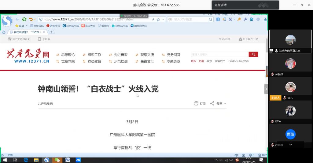 机关教职工在线举行了本学期第三次集体“学习日”,机关18位教职工在线学习《求是》杂志第6期刊发的习近平总书记署名文章——《为打赢疫情防控阻击战提供强大科技支撑》,集体学习战“疫”一线的党员事迹、火线发展党员事例,体会共产党人的初心使命,研讨如何在全球疫情防控严峻形势下落实好学校和学院2020年工作要点部署。