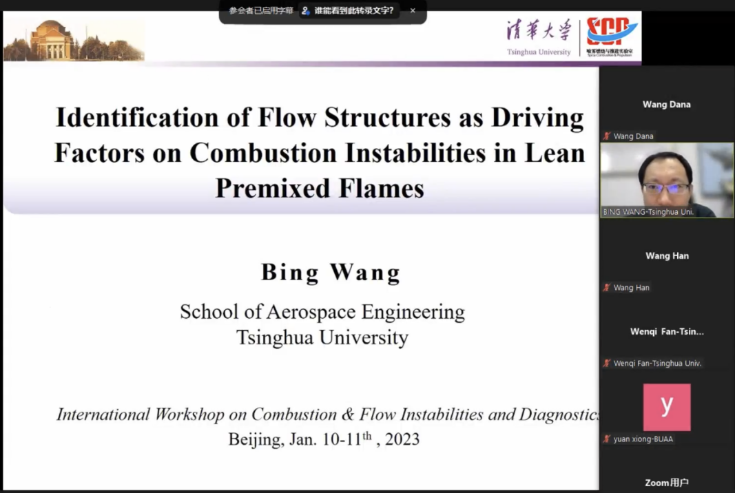 研讨会第二天的首个报告来自清华大学王兵教授,其报告题目为《Identification of flow structures as driving factors on combustion instabilities in lean premixed flames》。该报告针对贫燃预混火焰的热声不稳定性问题,分析了流动相干结构对燃烧不稳定性的影响。
