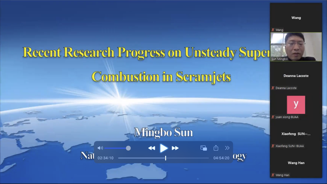 常务副院长潘翀教授在研讨会报告开始前进行了致辞。潘翀教授首先对来自世界各国的专家在新冠疫情流行的背景下,通过网络和北航进行深入的学术交流表达了感谢,并向与会的专家和师生表示了热烈欢迎。潘翀教授介绍了北航的基本情况和优势学科,祝贺了燃烧/流动不稳定性与诊断技术国际研讨会的顺利召开,并预祝研讨会顺利进行。