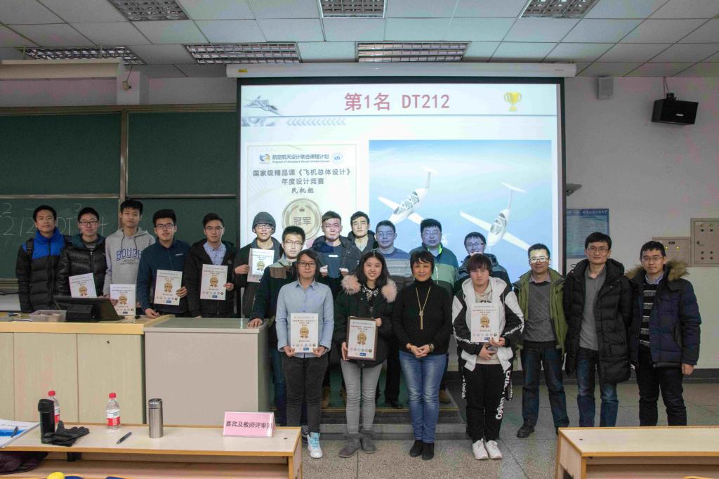 飞机系牵头的国家级精品课飞机总体设计2017-2018年度设计竞赛总决赛在主M202举行,从本学期三个分区近300名同学、33个设计小组中脱颖而出的3个军机(近距支援飞机)和3个民机(混合动力通用飞机)设计小组分别进行了总结汇报和辩论评审。应课程组邀请,北京理工大学宇航学院刘莉教授和龙腾教授、中国商飞北研中心张弛高级工程师、中国航天空气动力技术研究院赵俊波副主任分别到场并担任了评审嘉宾。经过紧张激烈的角逐,来自一分区的DT103小组和二分区DT212小组分别荣获军机组和民机组冠军。