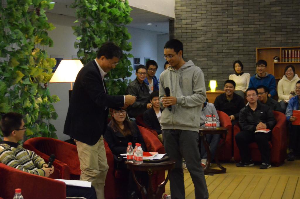 简短的交流之后,130512班班长关智元同学从班级组成、班级活动、班级精神风貌等方面向校长做了简明的介绍,并向校长赠送了同学亲手制作的小礼物。王鹏飞、张鑫、江东航、王佳一、党金强代表班级从不同的方面进行了发言。王鹏飞同学谈到了自己对书中一句话的感悟。张鑫同学则从学习和生活态度两方面对《优秀大学生成长手册》做了自己的阐述;江东航同学从书名展开思考,分别从优秀、大学生、成长,从这几个方面谈到了自己的经历;王佳一同学主要以获得能力、工作技能为重点对自己的成长做了评述;党金强同学则用“用心观察,认真倾听,及时行动”高度概括了自己的读书心得。