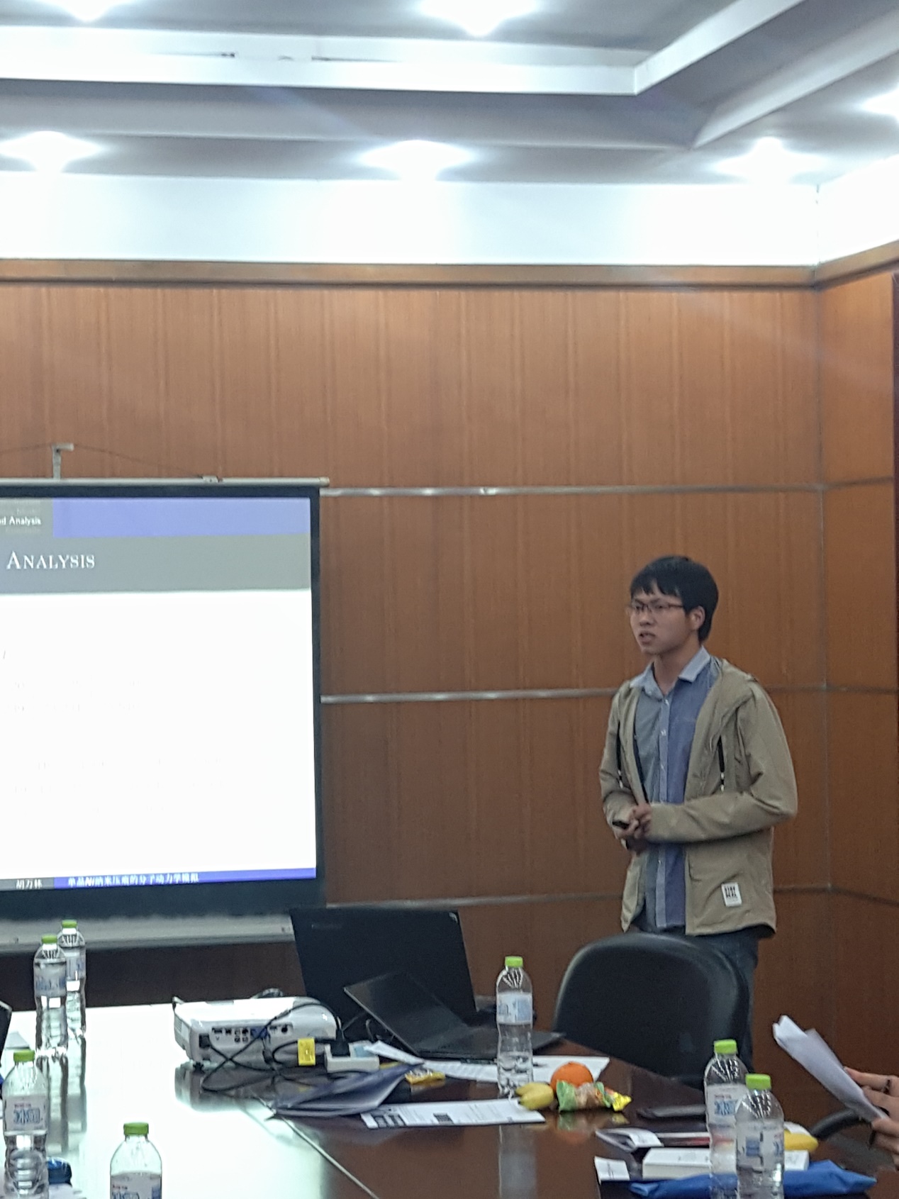 的胡万林同学作了题为《基于分子动力学的单晶镍纳米压痕模拟》的学术报告。在报告中,胡万林同学介绍了采用分子动力学(MD)方法,对单晶镍(Ni)纳米压痕过程进行数值模拟,研究其在纳米尺度上的力学行为。绘出单晶镍基体在球形压头作用下的载荷-位移曲线,分析载荷与位移的关系,发现在加载过程中会产生“位移突进”现象。将分子动力学模拟的结果与经典Hertz接触理论的解析解进行对比,符合良好。他发现:加载速率越大,压头半径越小,温度越高越容易发生“位移突进”现象,即越易发生局部的屈服;球形压头半径越大,残余塑形变形越大,塑形屈服区越大;不同压入深度的模拟结果,相当于同一加载过程的前后不同阶段,且压入深度越大,材料的硬度测量值会稍微增大。由载荷-位移图像求得材料的硬度和弹性模量,与材料实验测得的硬度和弹性模量相近。