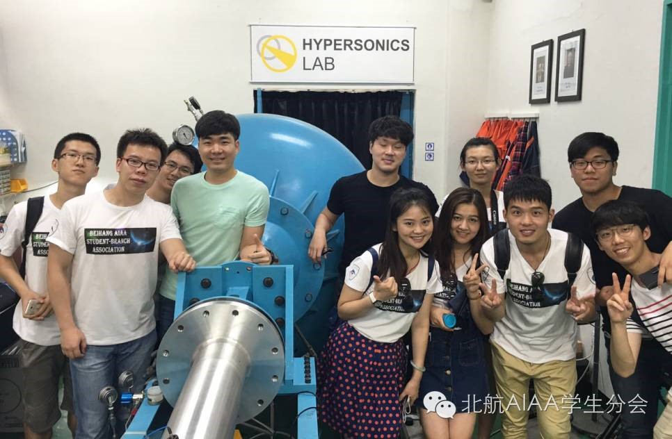 同时,KAIST-AIAA学生分会还安排队员们参观KAIST航模队基地以及各种重点实验室。其中,Seungchan Hong博士等人为队员们介绍了光-电-结构一体化实验室的主要研究课题,详细讲述了无人机智能机翼触觉端口技术、基于FPGA的超声传播成像探伤技术,以及无线超声传播成像用于远程扫描探测结构损伤系统;队员们还参观了空天系统与控制实验室,Seongheon Lee博士介绍了该实验室智能无人机路线规划、导航与制导的技术。Seongheon LEE博士则带队员们参观了高超声速实验室,并详细介绍了产生高超声速气流的实验装置。尖端一流的实验设备,近距离的仪器演示操作,以及博士们细致生动的讲解,使队员们收获颇丰。