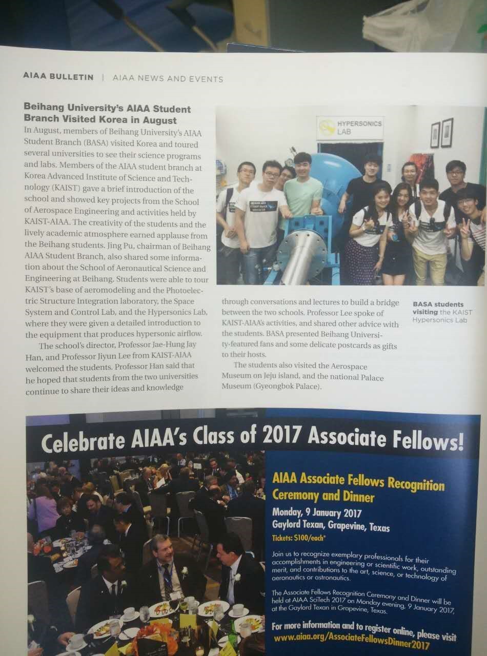 近日,北航AIAA学生分会赴韩国交流活动的新闻登上了美国AIAA下属杂志AEROSPACE的2016年度专刊。