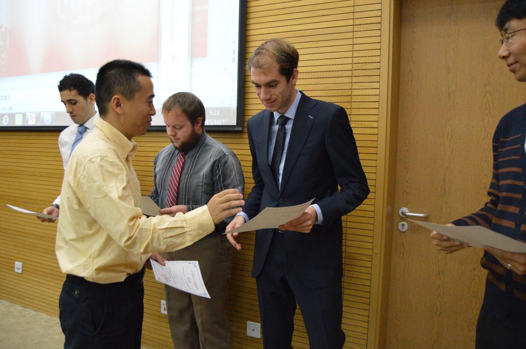 辅导员代表孙玉凯、外籍博士代表Ian Dettwiller依次发言。随后,研究生指导主任蒋崇文老师为外籍博士发放参会证书,并与外籍博士合影留念,标志着此次“歼十”杯学术论坛国际化分论坛正式开始。