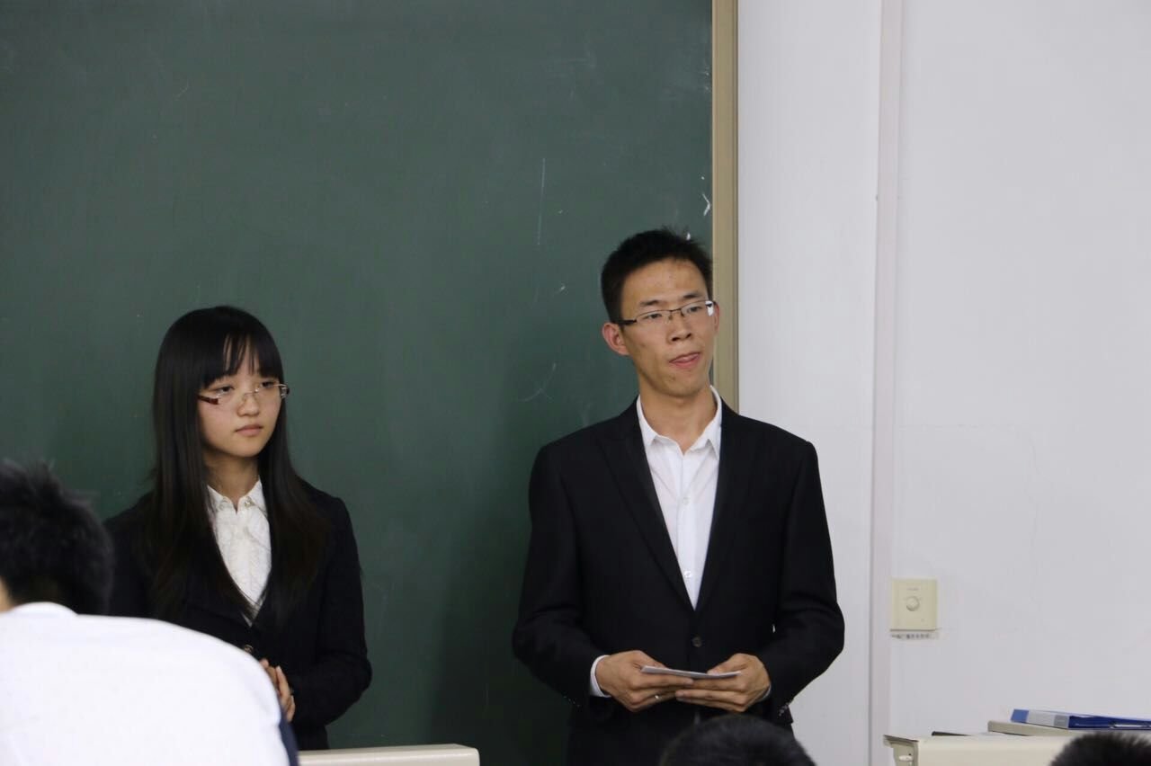 在新主楼B102教室举办的“先进研究生党支部”的评选活动,支部答辩选手是支部书记岳刘明和支部积极分子许秋怡。