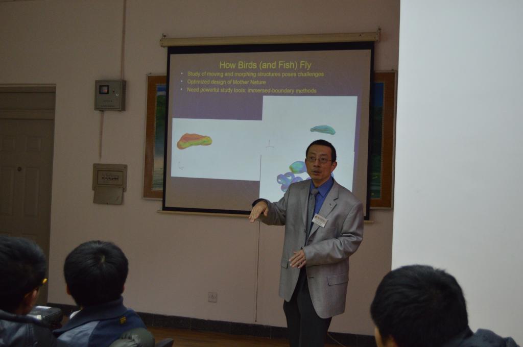 在流体所214会议室举办了一场别开生面的流体力学前沿讲座。此次讲座我们邀请到了堪萨斯大学 航空航天学院教授Zhongquan (Charlie) Zheng为大家介绍了CFD领域中浸没边界方法的研究。