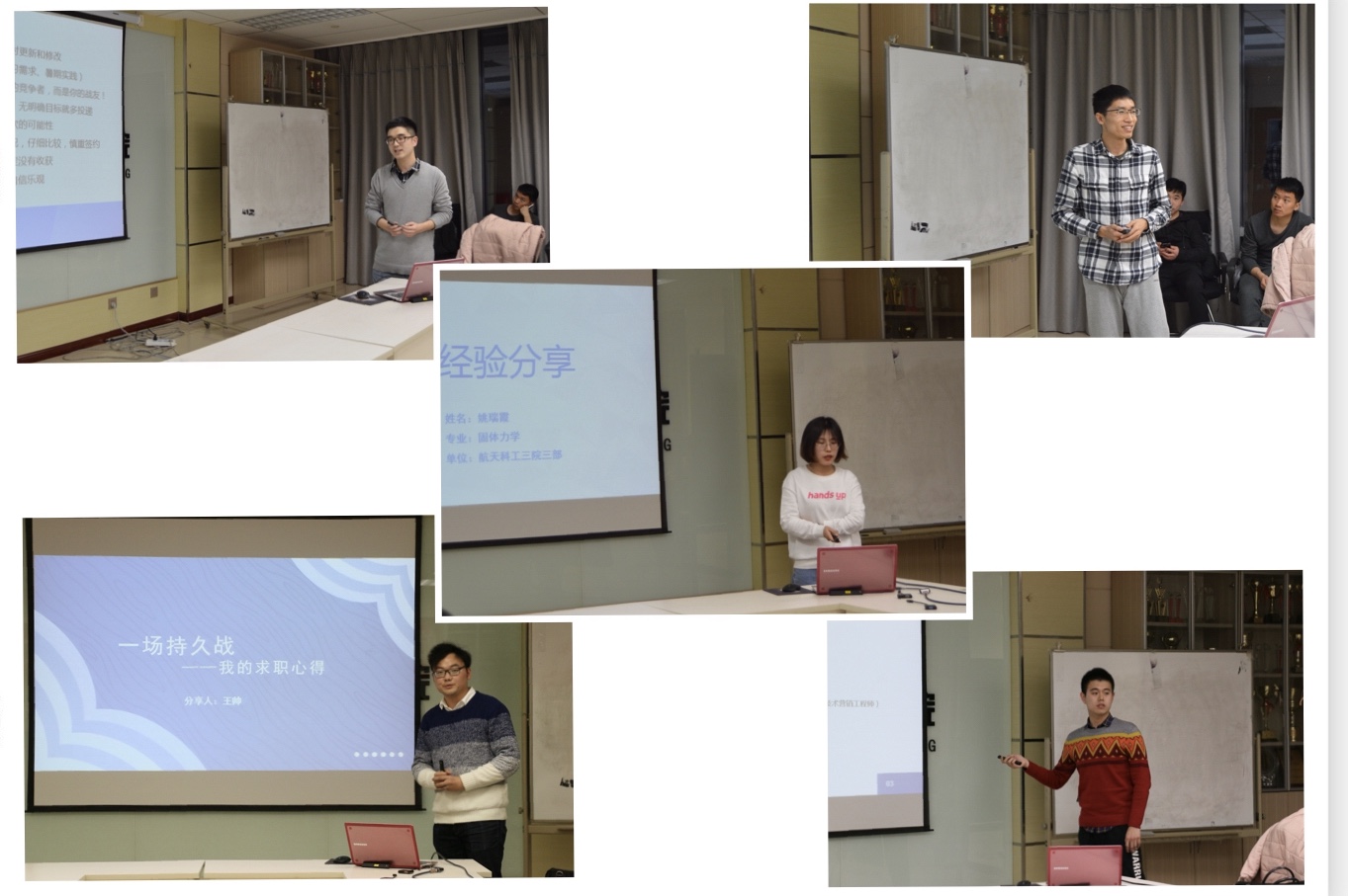 五位师兄师姐分别结合自己的求职经历和经验体会为大家展开分享。孙亦璋师兄分享了他在航天一院面试的经历及求职的心路历程,重点对就业规划要考虑的因素和简历制作需要注意的问题做出了具体详细的介绍;孔垂欢师兄讲述了自己求职准备和简历投递,并根据自身特点和发展规划在多份offer做出权衡,选择自己最心仪的职位;姚瑞霞师姐重点谈及各类面试的应对方法和注意事项,并强调了研二暑期实习的重要性,以及体育、文艺等特长是加分项;王帅师兄求职门类众多,包括航天科工、中航工业、中船重工、中电、中国航发及电信互联网行业如腾讯、华为等,求职经验丰富,扩宽了大家的就业视野,给了我们很好的启发;贺宇师兄作为我院理工科学生向银行、金融类方向求职的典型代表,讲述了自己为跨行业求职做的辅修学位、实习及其他一些必要的准备,对有意跨行业发展的同学是不错的指导和鼓舞。
