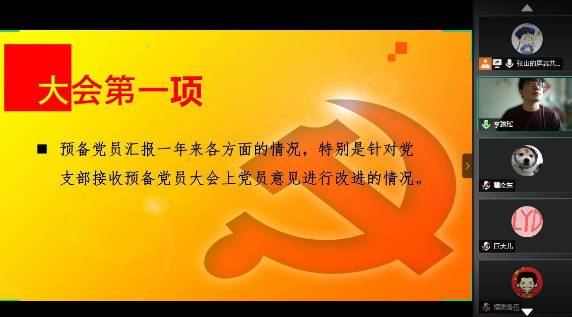 硕士生18054学生党支部在腾讯会议平台召开预备党员转正大会。本次会议讨论吴成益、李琳瑶、方康与严慧等4名同志在成为预备党员期间的表现,并接收四名同志为中共正式党员。