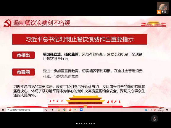 汤艳霞同志首先介绍了本次会议的主要内容,接着为支部同志们介绍了“杜绝餐饮浪费、践行节约风尚”的理论背景,从“遏制餐饮浪费刻不容缓”、“制止餐饮浪费的必要性”两个方面,借助生动详实的案例对餐饮浪费现象及遏制餐饮浪费的必要性进行了详细分析,让同志们对“杜绝餐饮浪费、践行节约风尚”有了更深刻的认识,并结合学校倡导的“光盘运动”,充分调动了同志们参与“光盘行动”的积极性和主动性。