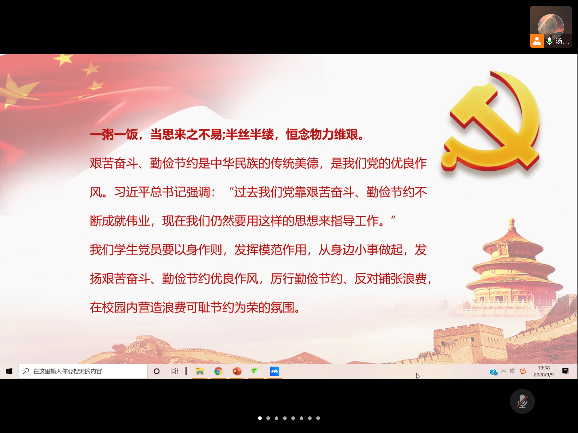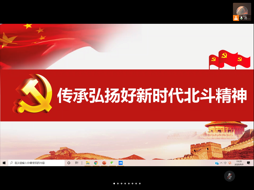 会议围绕“杜绝餐饮浪费、践行节约风尚”、“传承弘扬新时代北斗精神”、“反腐倡廉每季一课(2020年第三季度)”三个主题展开,由支部书记汤艳霞同志带领支部成员进行了学习。
