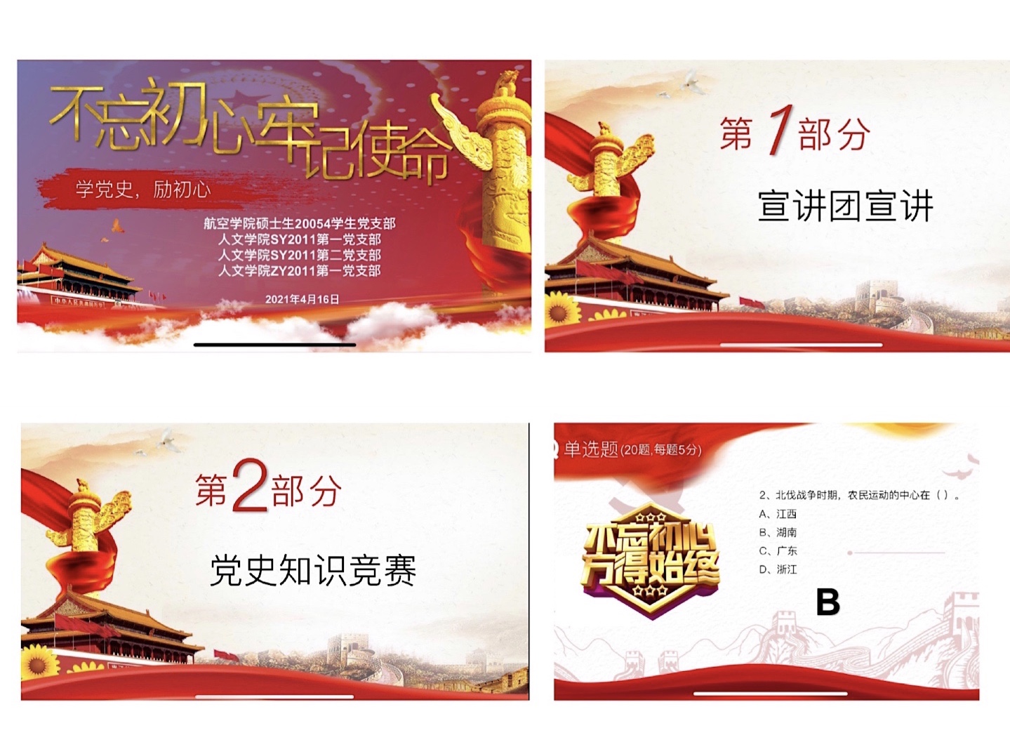 硕士生20054学生党支部、人文社会科学学院SY2011第一党支部、SY2011第二党支部、ZY2011党支部联合开展了“学党史、励初心”系列主题学习日活动。此次学习日活动主要分为宣讲和知识竞赛两个部分:来自北航研究生宣讲团的武佳奇讲师和北航民法典宣讲团的齐笑讲师分别做主题报告,在集体听取了宣讲报告后,支部成员开展了激烈且具趣味性的党史知识竞赛。活动由春满四合院