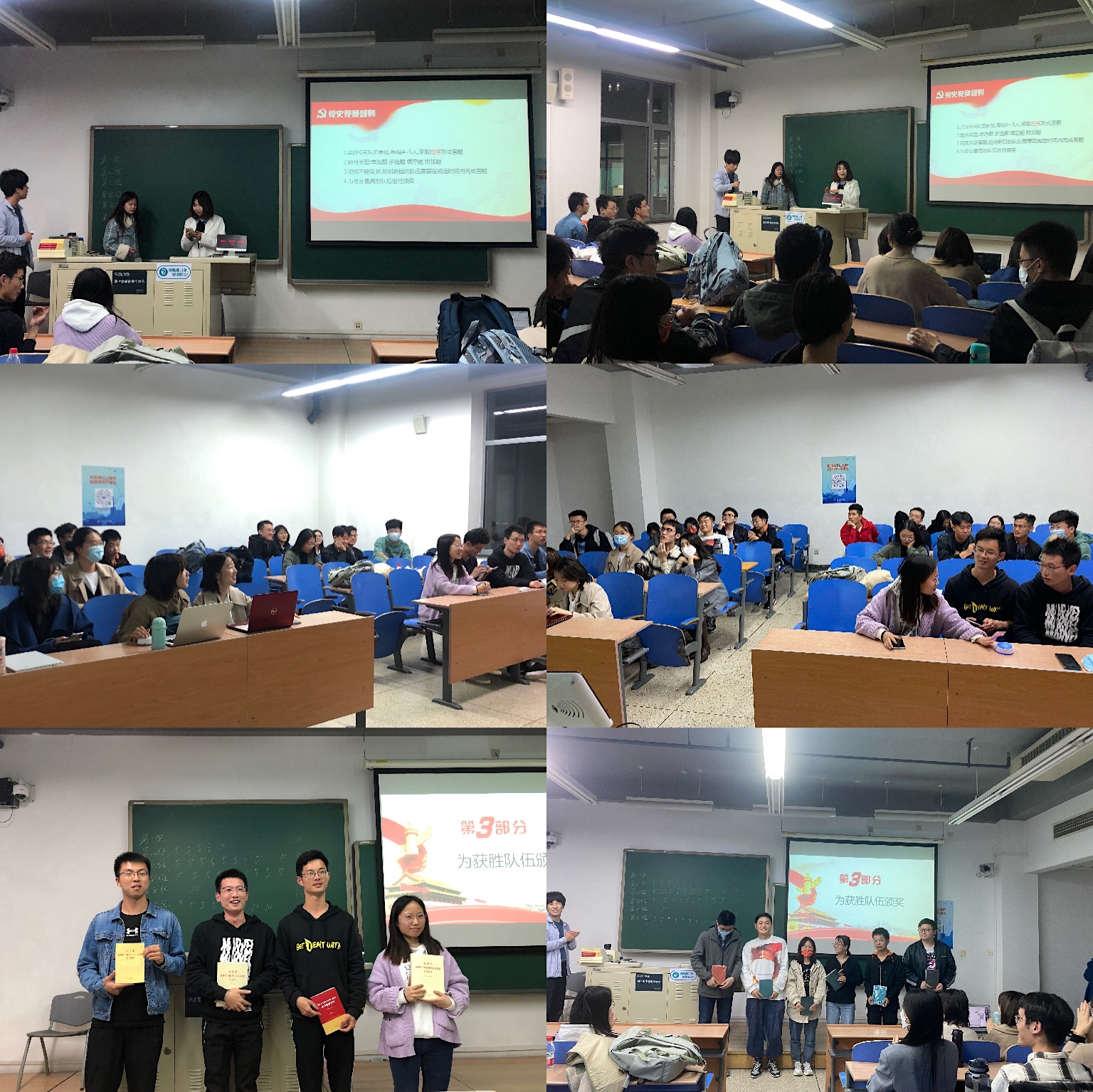 学习日活动第二个环节是党史知识竞赛,竞赛共设置20道单选题、10道多选题、5道填空题、5道附加题。六组参赛同学展开了激烈的答题,会场气氛也随着抢答环节高涨起来,最终“不忘初心”组获得第一名,获胜组每人分别得到了精美笔记本的奖励。为了鼓励大家加强党史理论方面的学习,比分落后的小组成员也领得了《论中国共产党历史》等相关理论书籍。收到书籍的党员表示会继续加强理论方面的学习,打好坚实理论基础。