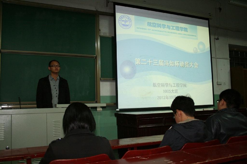 卓越辅导员发言 冯如杯动员大会现场 2012年10月14日晚6时30分,北航春满四合院 1005大班第二十三届冯如杯动员大会在学院路校区主-127教室顺利举行。