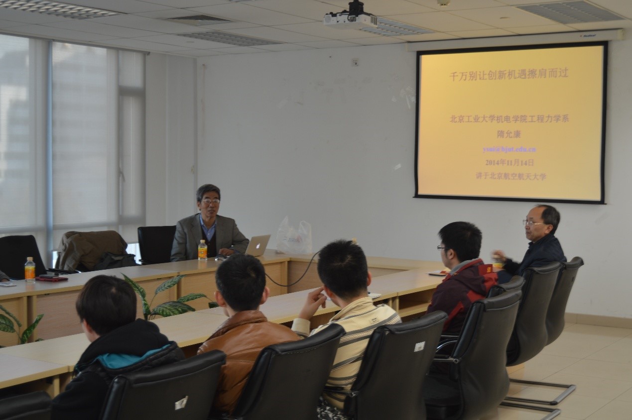 2014年11月21日下午2:30至4:30在春满四合院 C706会议室举办了春满四合院 固体力学前沿讲座本学期第9次报告,北京工业大学的隋允康教授应我院邢誉峰教授的邀请做了题为《千万别让创新机遇擦肩而过》的学术报告。