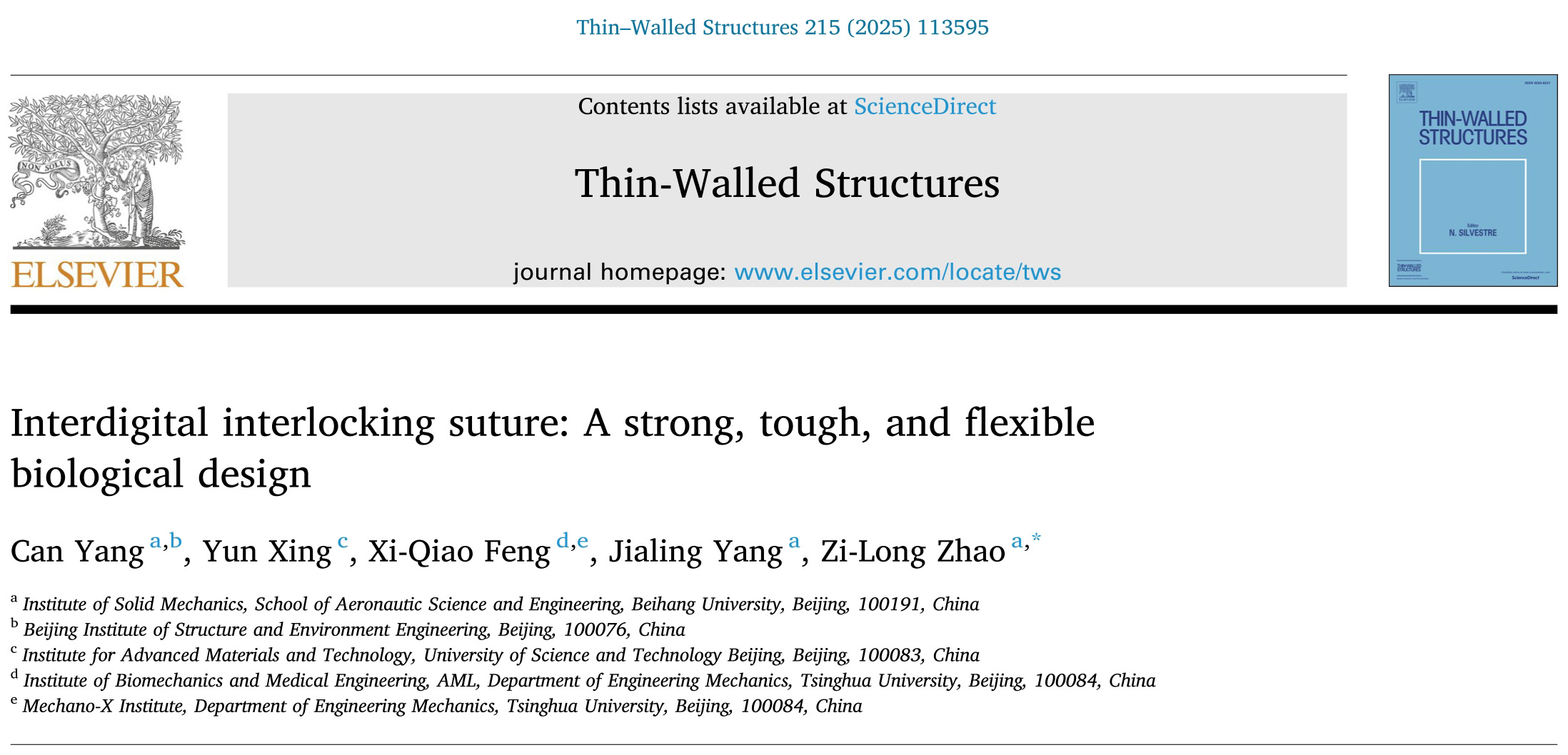 近日,我院赵子龙教授、杨嘉陵教授及其合作者在工程技术顶级期刊《Thin-Walled Structures》发表论文《Interdigital interlocking suture: A strong, tough, and flexible biological design》。他们以叉指型缝线结构为研究对象,建立了其变形与失效行为的力学分析模型,揭示了此类结构的形貌力学机理。 生物结构的界面形貌往往复杂而精巧,兼顾性质与功能。叉指型互锁结构不仅...