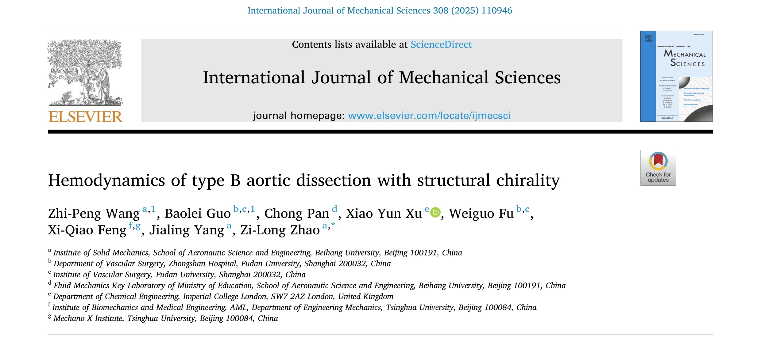 近日,我院赵子龙教授、潘翀教授、杨嘉陵教授等联合复旦大学、清华大学以及英国帝国理工学院等高校学者,在力学顶级期刊《International Journal of Mechanical Sciences》(中科院1区,影响因子9.4)发表论文《Hemodynamics of type B aortic dissection with structural chirality》,揭示了胸主动脉夹层(TBAD)螺旋形貌演化对血液流动和血管重塑的影响规律,为疾病诊治提供了科学依据。手性是生物材料的内禀属性。手性形貌...